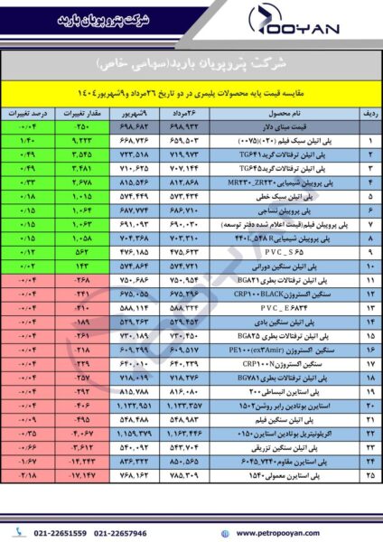 در معاملات امروز، در جدول مقایسهای کالاهای پلیمری، سبک فیلمها با 1.4 درصد افزایش، 922 تومان رشد قیمت پیدا کردند و در صدر جدول افزایشی ها ایستادند. پت های نساجی نیز با 49صدم درصد افزایش،348 تا 354 تومان نسبت به دو هفته پیش رشد قیمت داشتند و در جایگاه دوم و سوم ایستادند.