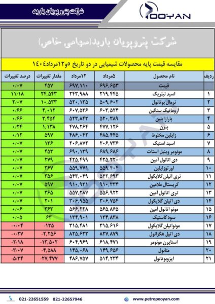در طرف مقابل، ایزوبوتانول با افت 5/34 درصدی و کاهش 2,747 تومانی نسبت به هفتهی گذشته، بیشترین کاهش قیمت را تجربه کرد. همچنین متانول با کاهش 3/07 درصدی (458 تومان) و استایرن مونومر با افت 2/18 درصدی (1,350 تومان) در دستهی کالاهای کاهشی قرار گرفتند. این نوسانات، تصویری روشن از تغییرات پیاپی و قابلتوجه بازار مواد شیمیایی در روزهای اخیر ارائه میدهند.