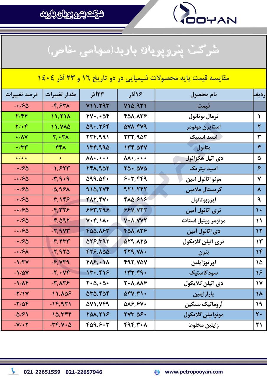 در سوی دیگر، زایلین مخلوط با افت 7/02 درصدی، بیشترین کاهش قیمت را تجربه کرد و نسبت به هفته قبل، 3,470 تومان ارزانتر معامله شد. همچنین مونو اتیلن گلایکول با کاهش 5/61 درصدی به میزان 1,534 تومان و آروماتیک سنگین با افت 2/54 درصدی به میزان 1,492 تومان نسبت به هفته گذشته، در دسته کالاهای کاهشی قرار گرفتند. این تغییرات نشاندهنده نوسانهای قابل توجه در بازار مواد شیمیایی طی روزهای اخیر است.
