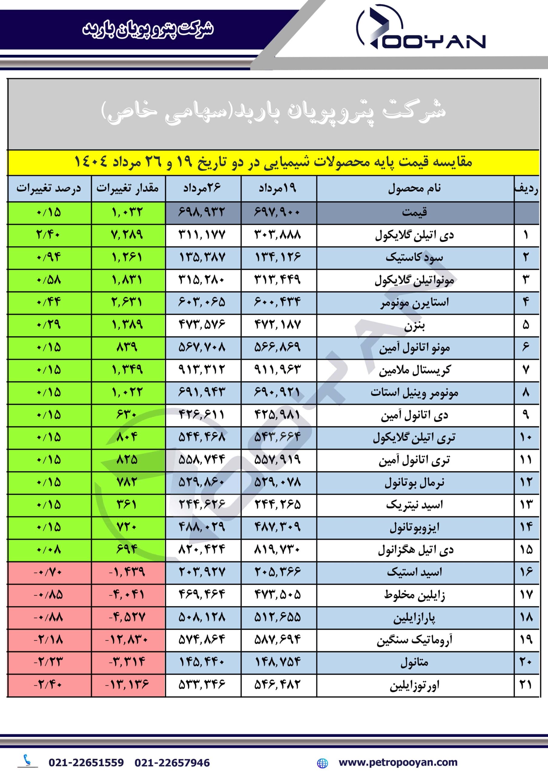 قیمت پایه محصولات پتروشیمی در تاریخ یکشنبه 26 مرداد 1404 با دلار توافقی بازار مبادله 69,893 تومان , برای عرضه مواد اولیه پتروشیمی در بورس کالا تا یکشنبه 9 شهریور ماه 1404 اعلام شد که 103 تومان, معادل 1 درصد, افزایش داشت.