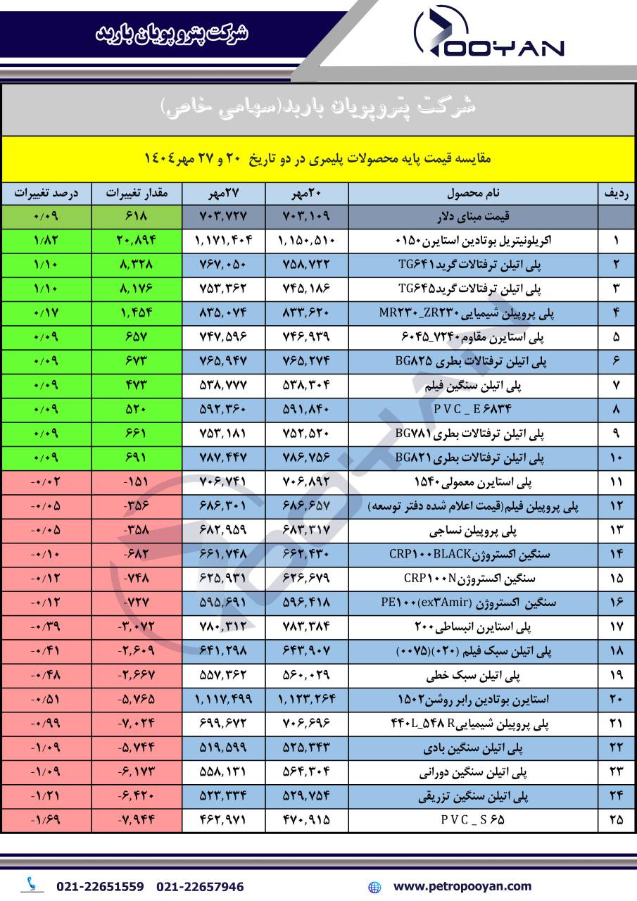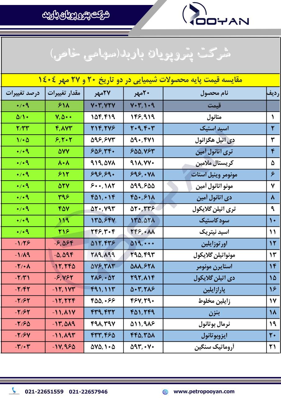 قیمت پایه محصولات پتروشیمی در تاریخ یکشنبه 27 مهر 1404 با دلار توافقی بازار مبادله 70,327 تومان , برای عرضه مواد اولیه پتروشیمی در بورس کالا تا یکشنبه 4 آبان ماه 1404 اعلام شد که 61 تومان, معادل 9صدم درصد, افزایش داشت.