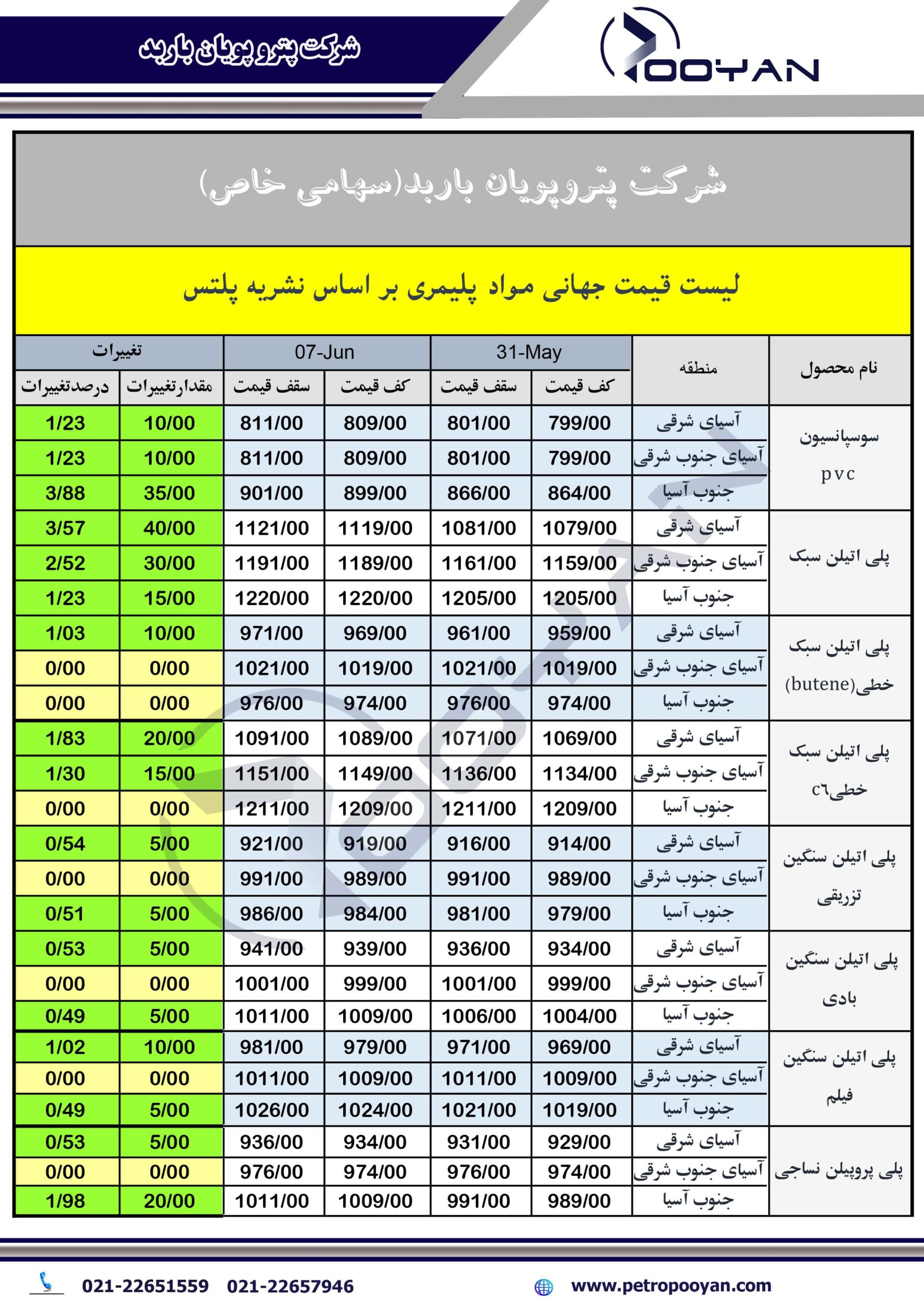 در جدید ترین گزارش نشریه پلتس به بررسی تغییرات قیمت محصولات شیمیایی و پلیمری در دو تاریخ ۳۱ مه و 7 ژوئن ۲۰۲۴ پرداخته است که در زیر می توانیم شاهد روند صعودی یا نزولی این تغییرات می پردازیم: