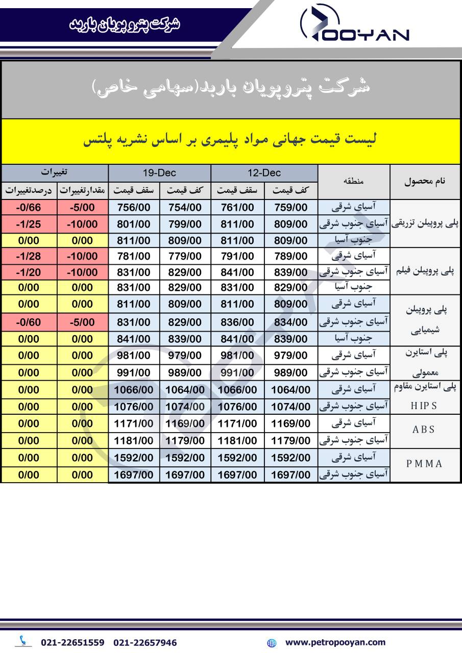 در جدیدترین گزارش نشریه پلتس به بررسی تغییرات قیمت جهانی محصولات پتروشیمی در دو تاریخ 12 دسامبر و 19 دسامبر 2025 پرداخته است که در زیر می توانیم شاهد روند صعودی یا نزولی این تغییرات می پردازیم: