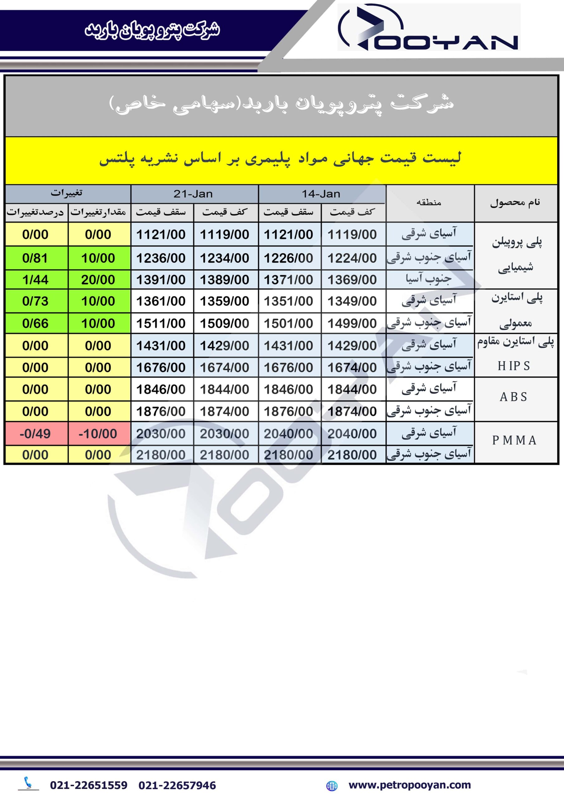 در گزارش جدید ترین نشریه پلتس به بررسی تغییرات قیمت محصولات شیمیایی و پلیمری در دو تاریخ 14 ژانویه و 21 ژانویه پرداخته است که در زیر می توانیم شاهد روند صعودی یا نزولی این تغییرات باشیم: