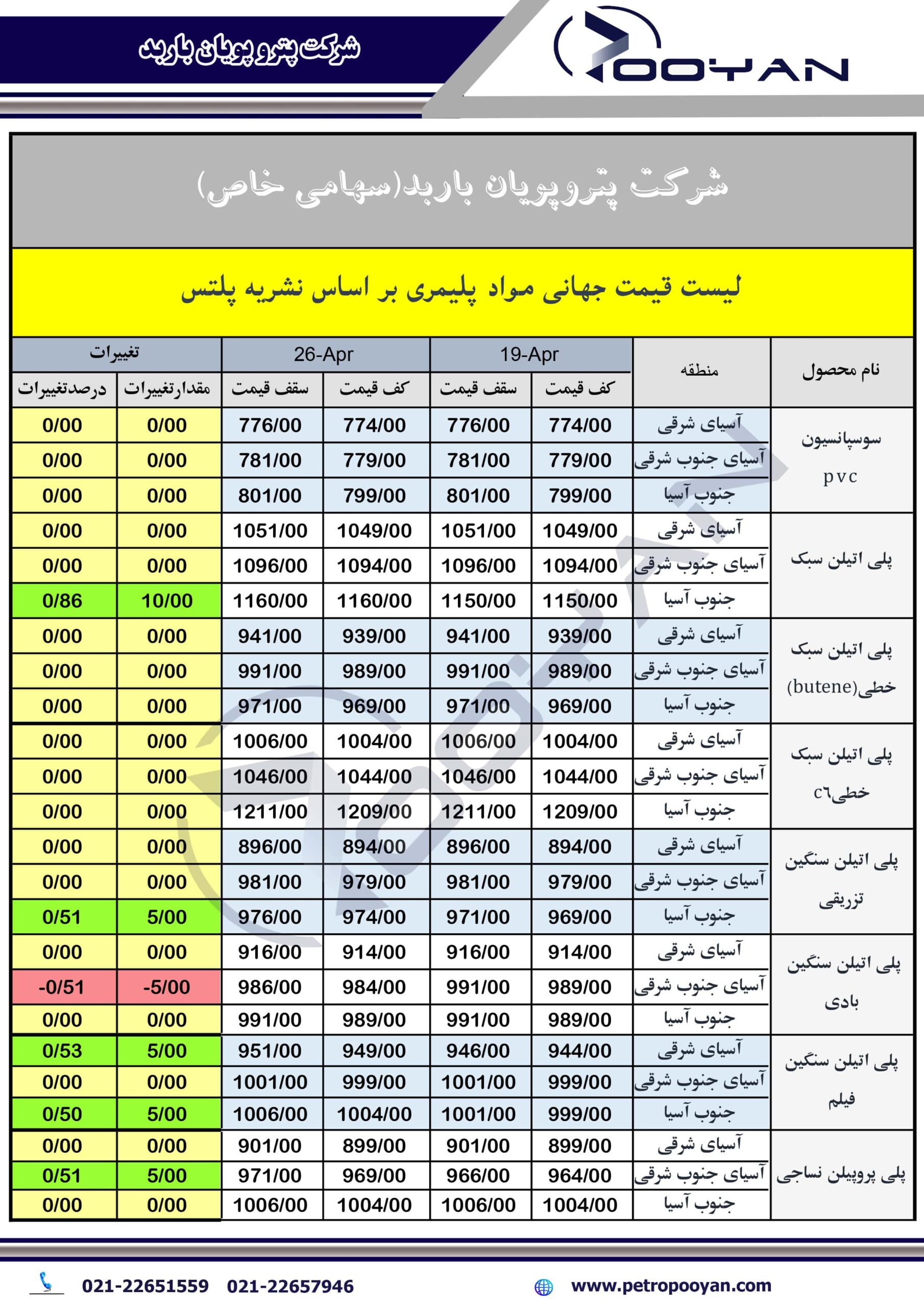 تغییرات قیمت جهانی محصولات پتروشیمی تا 26 آپریل 2024 + دانلود
