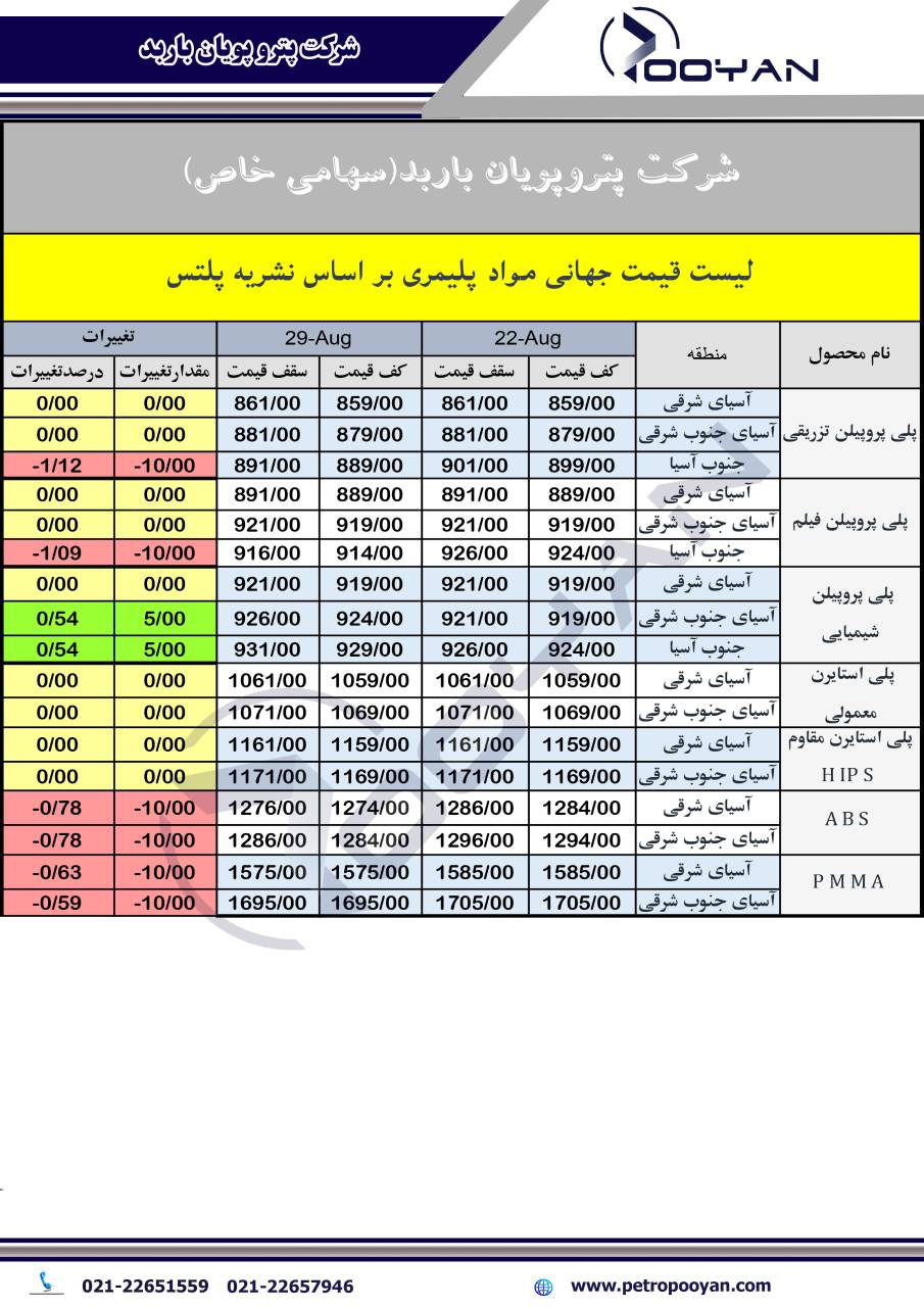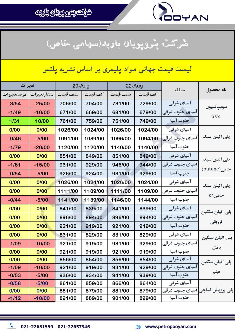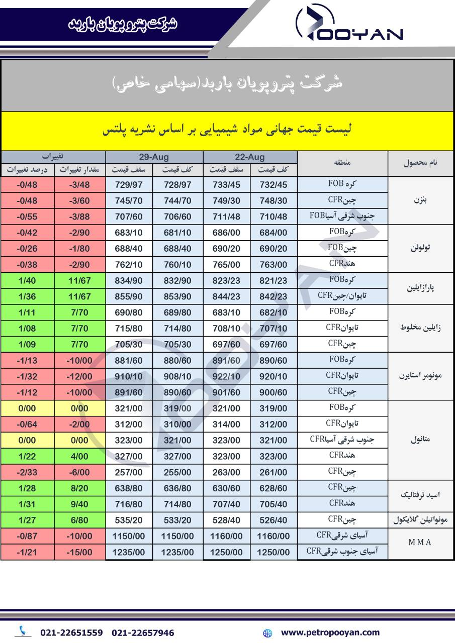 در جدیدترین گزارش نشریه پلتس به بررسی تغییرات قیمت جهانی محصولات پتروشیمی در دو تاریخ 22 آگوست و 29 آگوست 2025 پرداخته است که در زیر می توانیم شاهد روند صعودی یا نزولی این تغییرات می پردازیم: